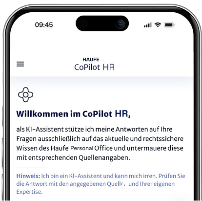 Das Fachwissen des Haufe CoPilot HR besteht aus den rechtssicheren Inhalten des Haufe Personal Office. Der Haufe CoPilot HR erfasst den Sinn und die Semantik einer Anfrage und basierend darauf extrahiert er relevante Inhalte aus der Fachdatenbank. Auf dieser Grundlage minimieren wir Fehlerquellen signifikant. Trotzdem sollte – wie bei jeder KI – die Antwort gegebenenfalls geprüft werden. Dazu zeigt der Haufe CoPilot HR die Quellen an, die der Antwort zugrunde liegen. Diese können über einen Link im Haufe Personal Office jederzeit schnell und einfach aufgerufen werden. Nutzen Sie außerdem die klassische Recherche in Ihrem Personal Office, um die Richtigkeit der Antwort zu verifizieren.