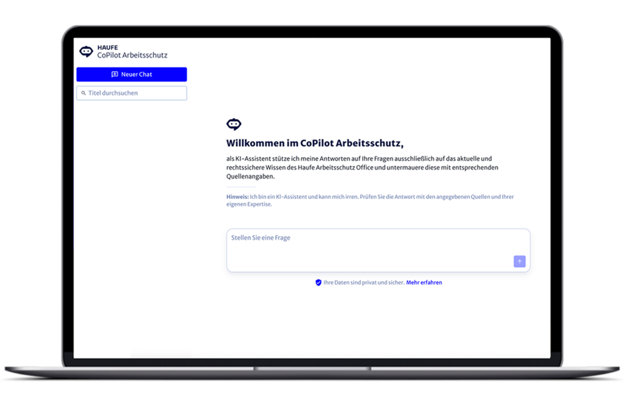 Treten Sie in den Dialog: CoPilot Arbeitsschutz ist ein auf Künstlicher Intelligenz (KI) basierender Assistent, welcher im Dialog Ihre Praxisfragen im Arbeits- und Gesundheitsschutz schnell und bequem beantwortet. Als Bestandteil von Haufe Arbeitsschutz Office Professional basiert sein Wissen ausschließlich auf den rechtssicheren Inhalten der Fachdatenbank. Die verwendeten Quellen sind am Ende jeder Antwort angegeben und verlinkt.