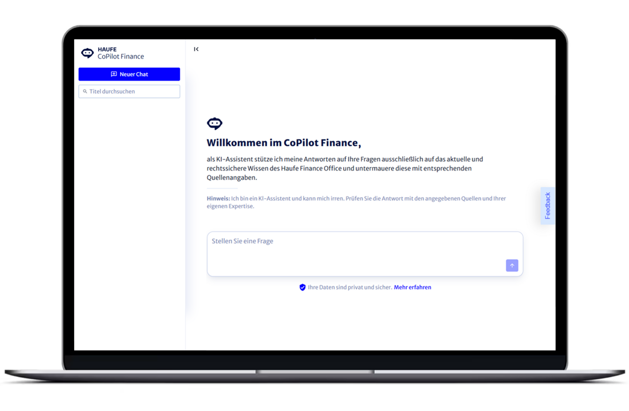 Treten Sie in den Dialog: CoPilot Finance ist ein auf Künstlicher Intelligenz (KI) basierender Assistent, welcher im Dialog Ihre Praxisfragen im Rechnungswesen schnell und bequem beantwortet. Als Bestandteil aller Haufe Finance Office Versionen basiert sein Wissen ausschließlich auf den rechtssicheren Inhalten der Fachdatenbank. Die verwendeten Quellen sind am Ende jeder Antwort angegeben und verlinkt.
