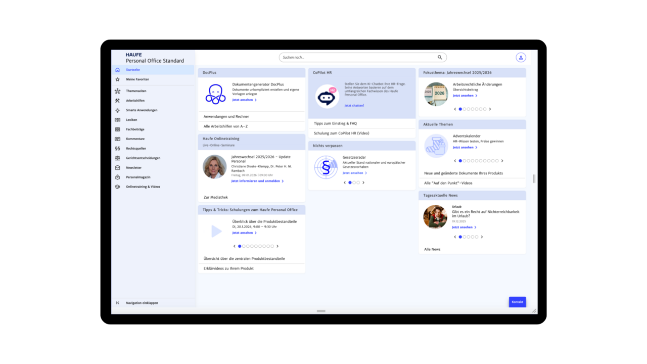 Über die Startseite steigen Sie sofort in die Fachinhalte ein. Sie haben direkten Zugriff auf die wichtigsten Tools wie den CoPilot HR oder den Lohn- und Gehaltsrechner. Zudem finden Sie einen Überblick über alle brandaktuellen Themen und Trends. Rufen Sie anstehende Online-Seminare ebenfalls direkt auf.