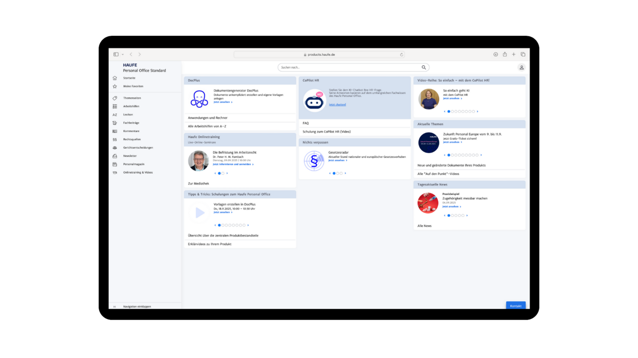 Über die Startseite steigen Sie sofort in die Fachinhalte ein. Sie haben direkten Zugriff auf die wichtigsten Tools wie den CoPilot HR oder den Lohn- und Gehaltsrechner. Zudem finden Sie einen Überblick über alle brandaktuellen Themen und Trends. Rufen Sie anstehende Online-Seminare ebenfalls direkt auf.