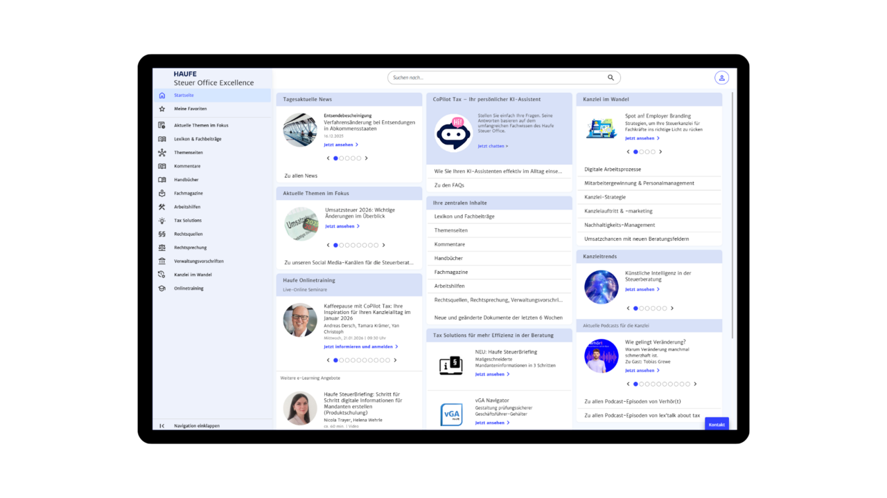 Haufe Steuer Office Excellence unterstützt die gesamte Steuerkanzlei zuverlässig bei der täglichen Arbeit und vermittelt gleichzeitig das Know-how, um Zukunftsthemen systematisch anzugehen. Alle Inhalte sind speziell für die Datenbank konzipiert, perfekt aufeinander abgestimmt und digital erfasst – ohne Dopplungen oder Lücken, wie sie in Einzelwerken oft vorkommen. Mit 21 Kommentaren, digitalen Handbüchern, Arbeitshilfen und Themenwelten zu Steuerrecht, Rechnungswesen, Personal, Kanzleimanagement und Kanzlei im Wandel finden Sie und Ihre Mitarbeiter alles an einem Ort, strukturiert und durchsuchbar.