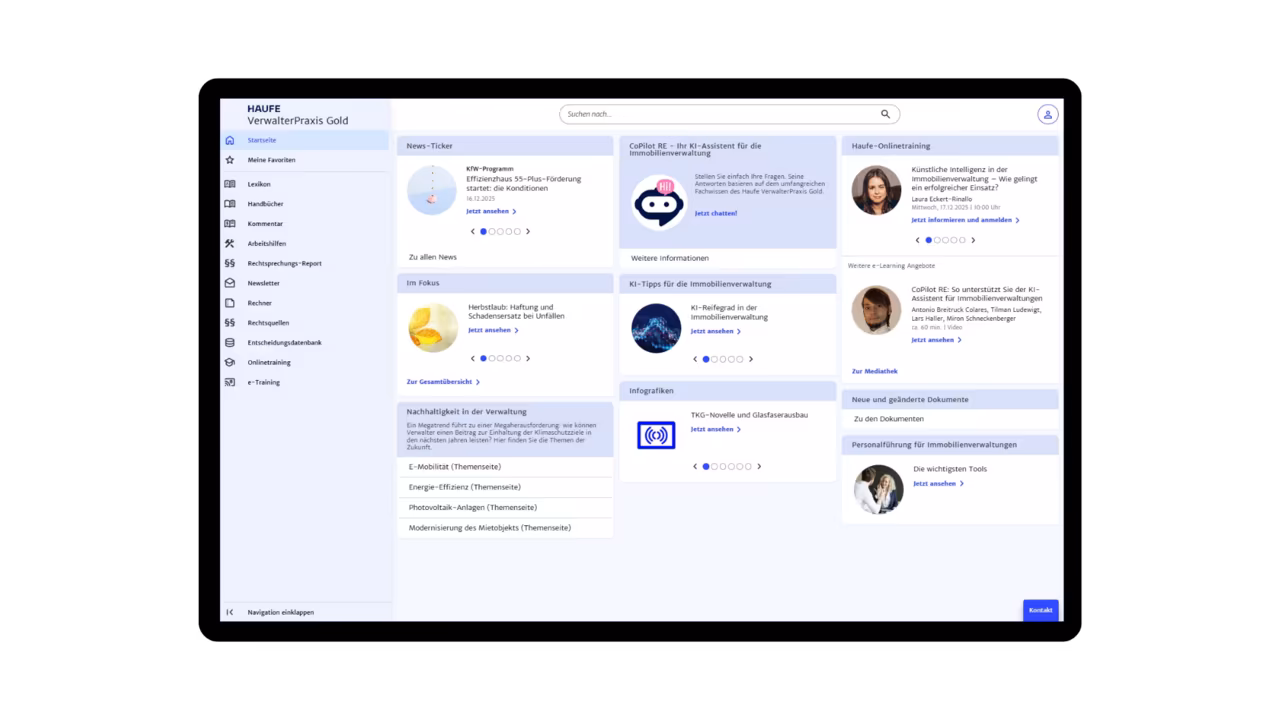 In der einzigen Online-Wissensdatenbank finden Sie zahlreiche Fachbeiträge, Infografiken und Gesetzestexte zu allen relevanten rechtlichen Themen rund um die Immobilienverwaltung.