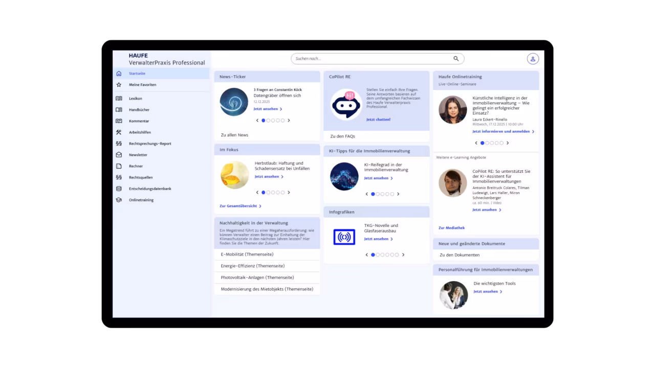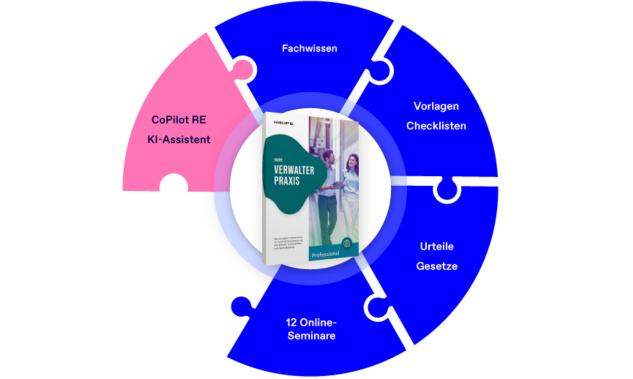 Haufe VerwalterPraxis Professional vereint den KI-Assistenten CoPilot RE mit rechtlich geprüften Fachinhalten, einer umfassenden Fachdatenbank sowie 12 Online-Seminaren. So haben Sie praxisnahe und rechtssichere Unterstützung in der Miet- und WE-Verwaltung.
