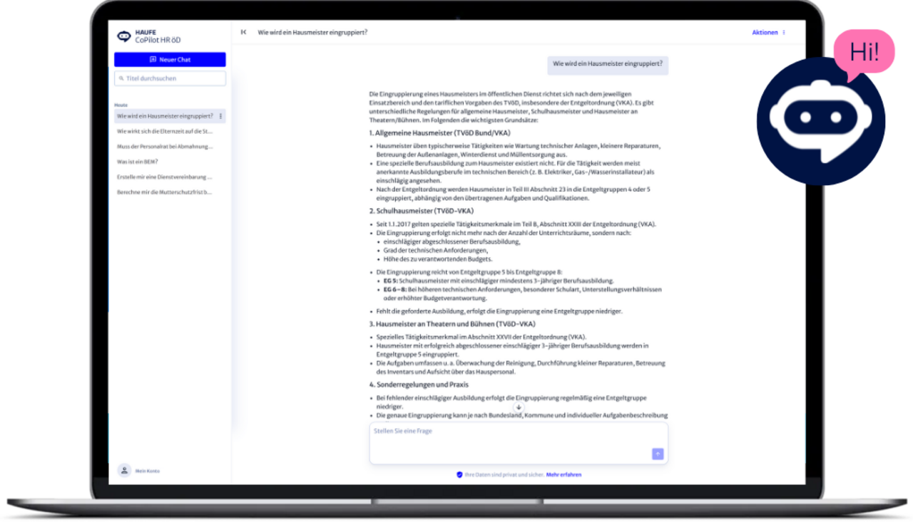 Jetzt neu: Mit dem KI-Assistent CoPilot HR öD erhalten Sie blitzschnell und fundiert Antworten auf Ihre Personalfragen zum TVöD. Damit bringen Sie Effizienz und Sicherheit auf ein neues Level!