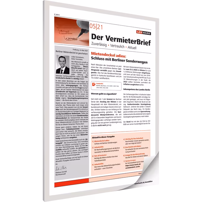 12-mal jährlich im Format A4 mit je 8 Seiten zum Jahresbezugspreis von € 166,00 inkl. MwSt. inklusive Portokosten. Bei Jahresrechnung ist der Vermieter-Brief steuerlich voll absetzbar!